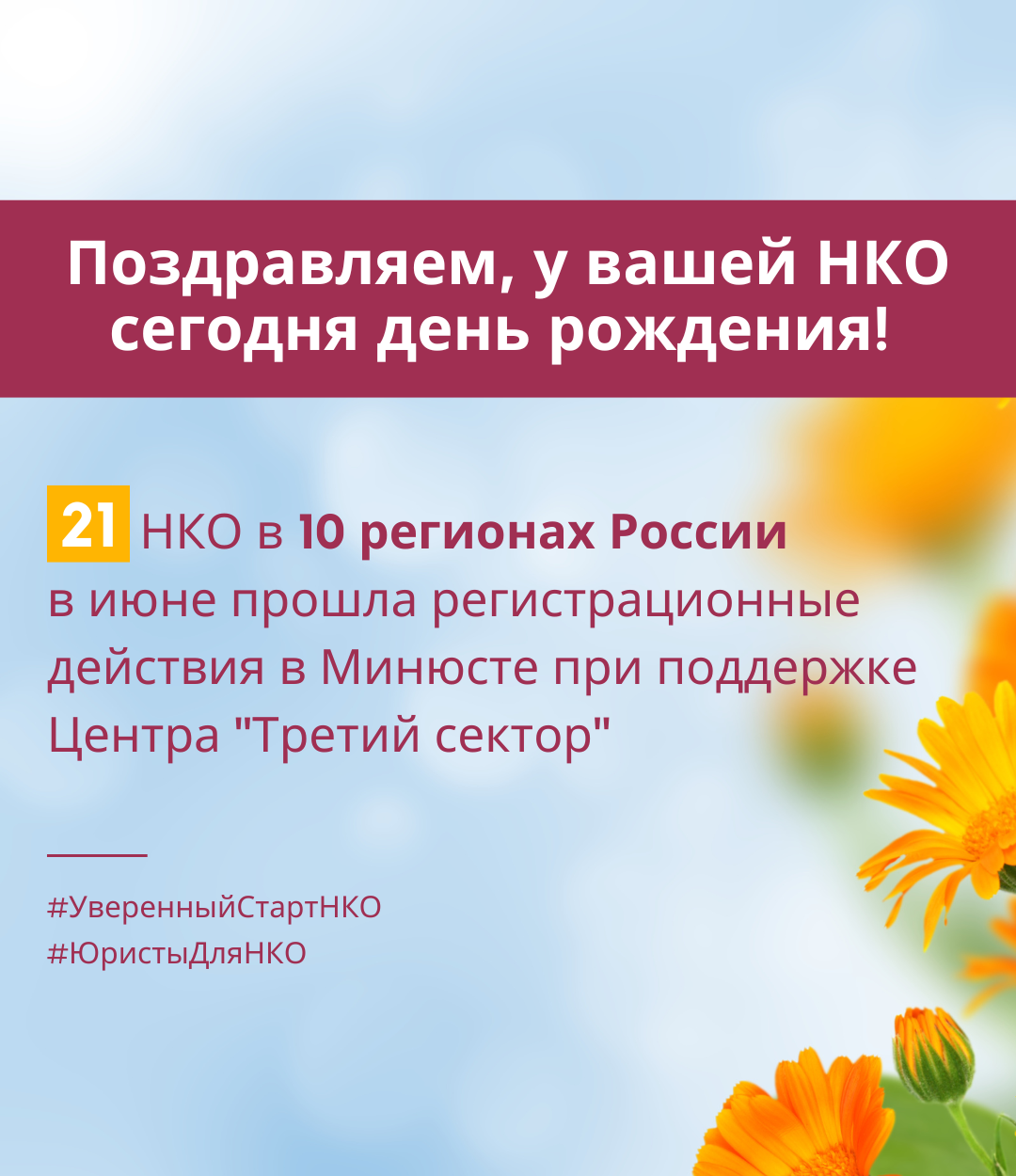 21 некоммерческая организация из 10 регионов России в июне при поддержке юристов Правового ресурсного центра "Третий сектор" прошла разные регистрационные действия в территориальных управлениях Минюста России. Кто-то открывал организации под новые проекты, а кто-то актуализировал устав или менял сведения, содержащиеся в ЕГРЮЛ.