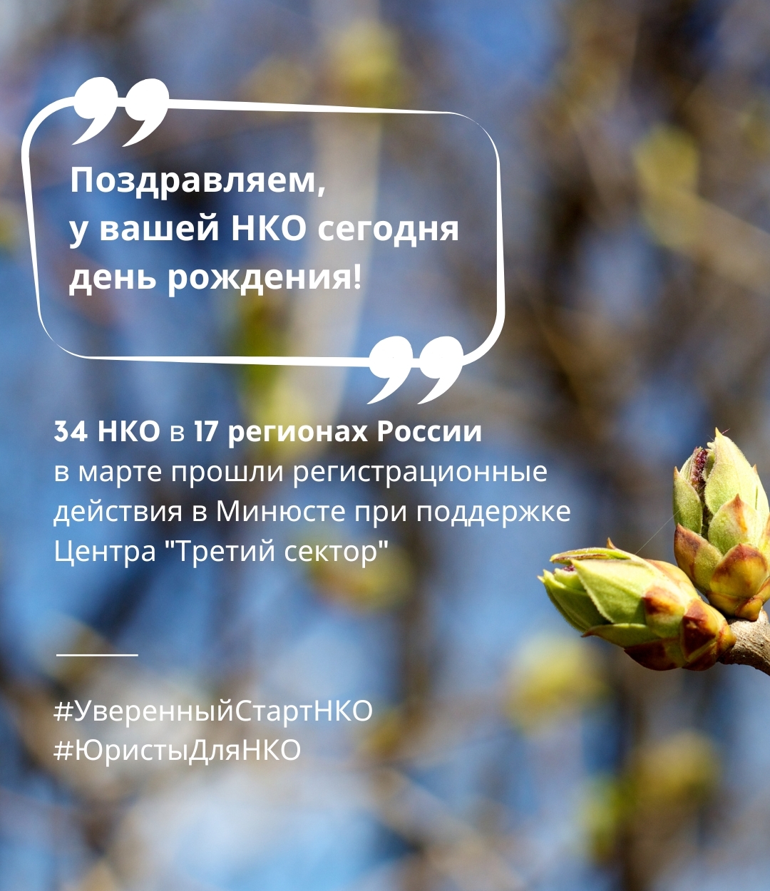 34 некоммерческие организации в 17 регионах России в марте при поддержке юристов Правового ресурсного центра "Третий сектор" прошли разные регистрационные действия в территориальных управлениях Минюста России. Мы открывали НКО под новые социальные и культурные проекты, вносили изменения в уставы, а также изменяли сведения в ЕГРЮЛ.