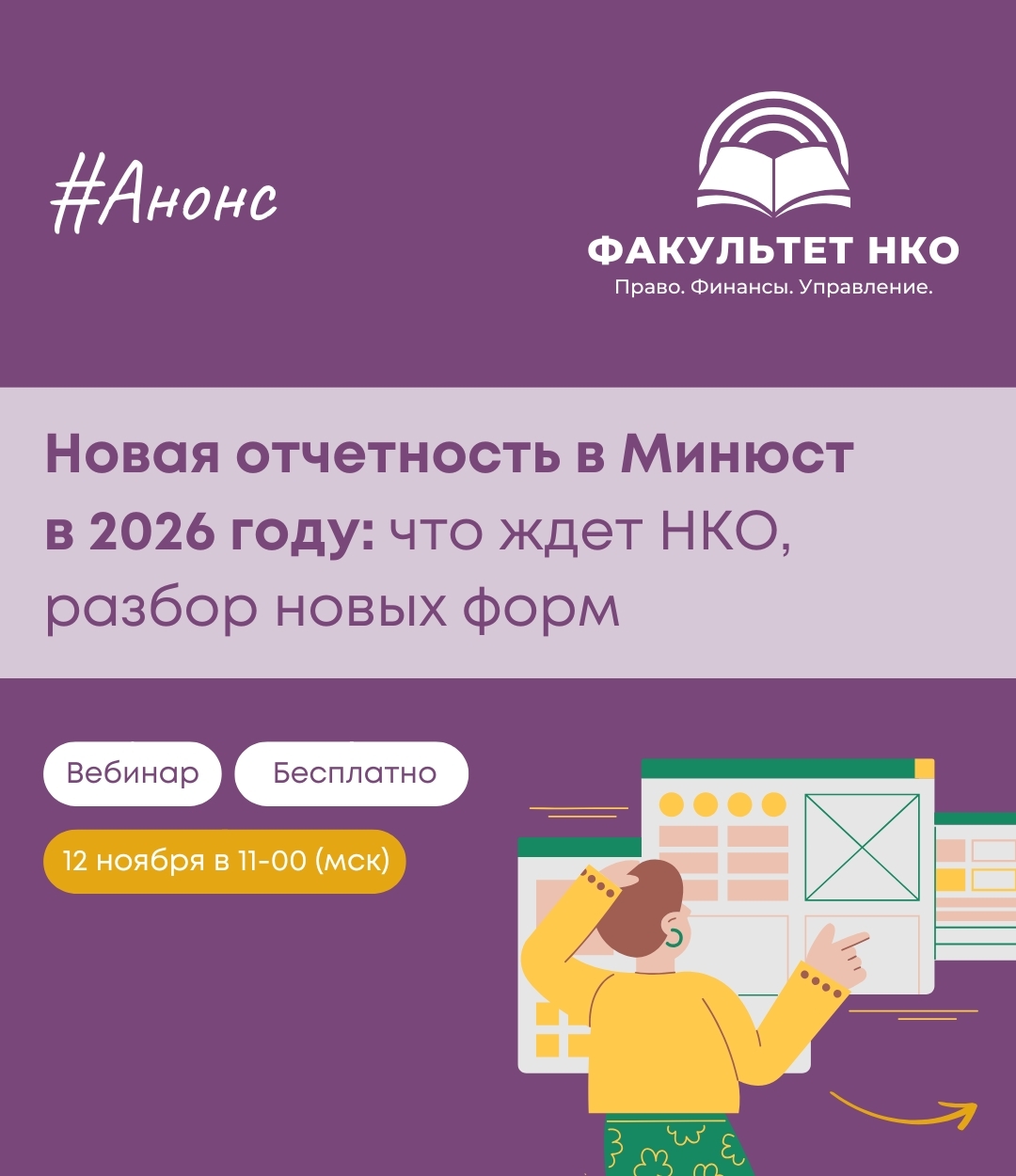 12 ноября на Факультете НКО состоялся открытый вебинар на тему "Новая отчетность в Минюст в 2026 году: что ждет НКО, разбор новых форм". Ведущим встречи выступил Артем Селитраров, юрист, директор Правового ресурсного центра поддержки НКО "Третий сектор".