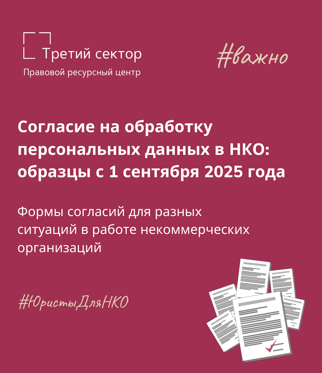 Юристы Правового ресурсного центра "Третий сектор" подготовили актуальные формы согласий на обработку персональных данных. Материал сделан в форме "коробочного решения" и включает в себя ключевые разъяснения, а также разные варианты согласий на обработку и распространение персональных данных в некоммерческих организациях, в том числе: