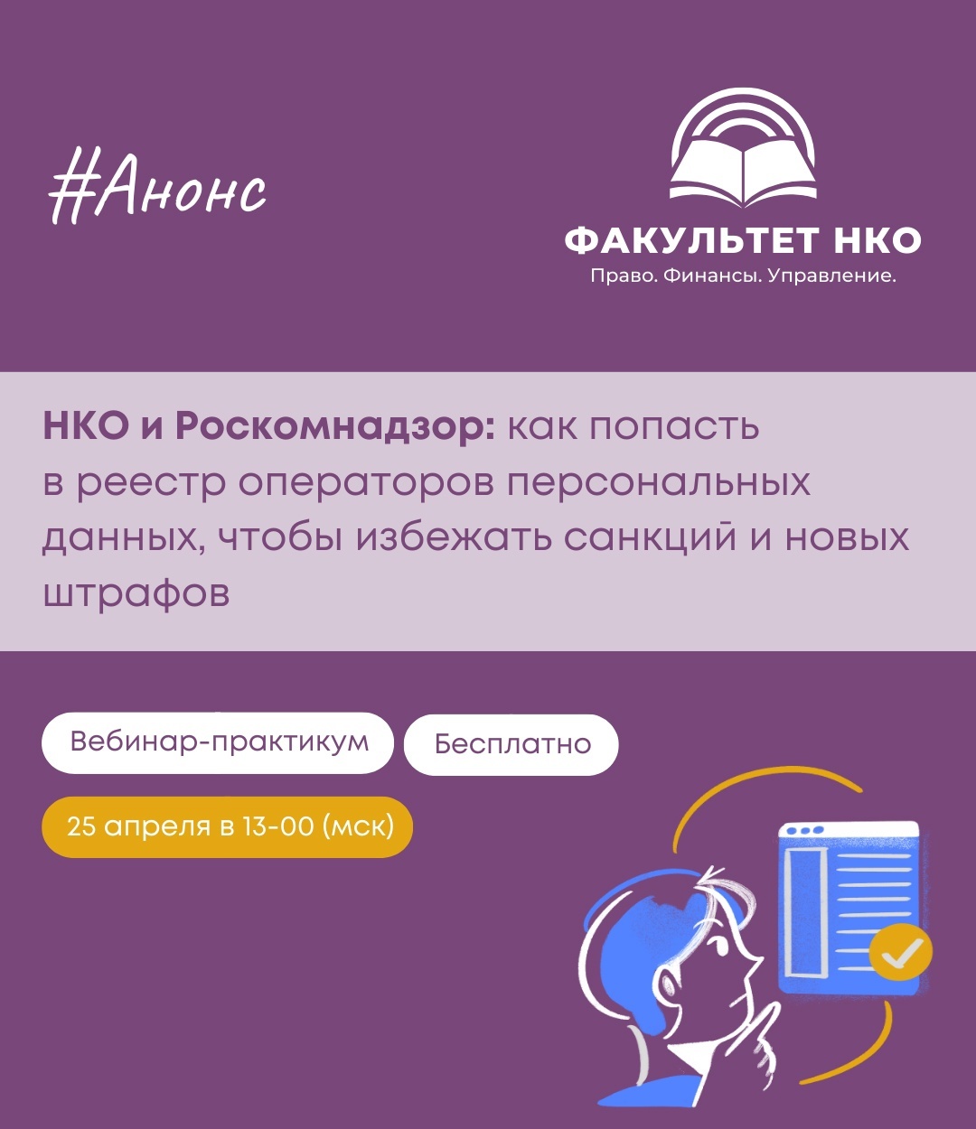 В ближайшую пятницу, 25 апреля, состоится открытый вебинар на Факультете НКО. Тема встречи: "НКО и Роскомнадзор: как попасть в реестр операторов персональных данных, чтобы избежать санкций и новых штрафов".