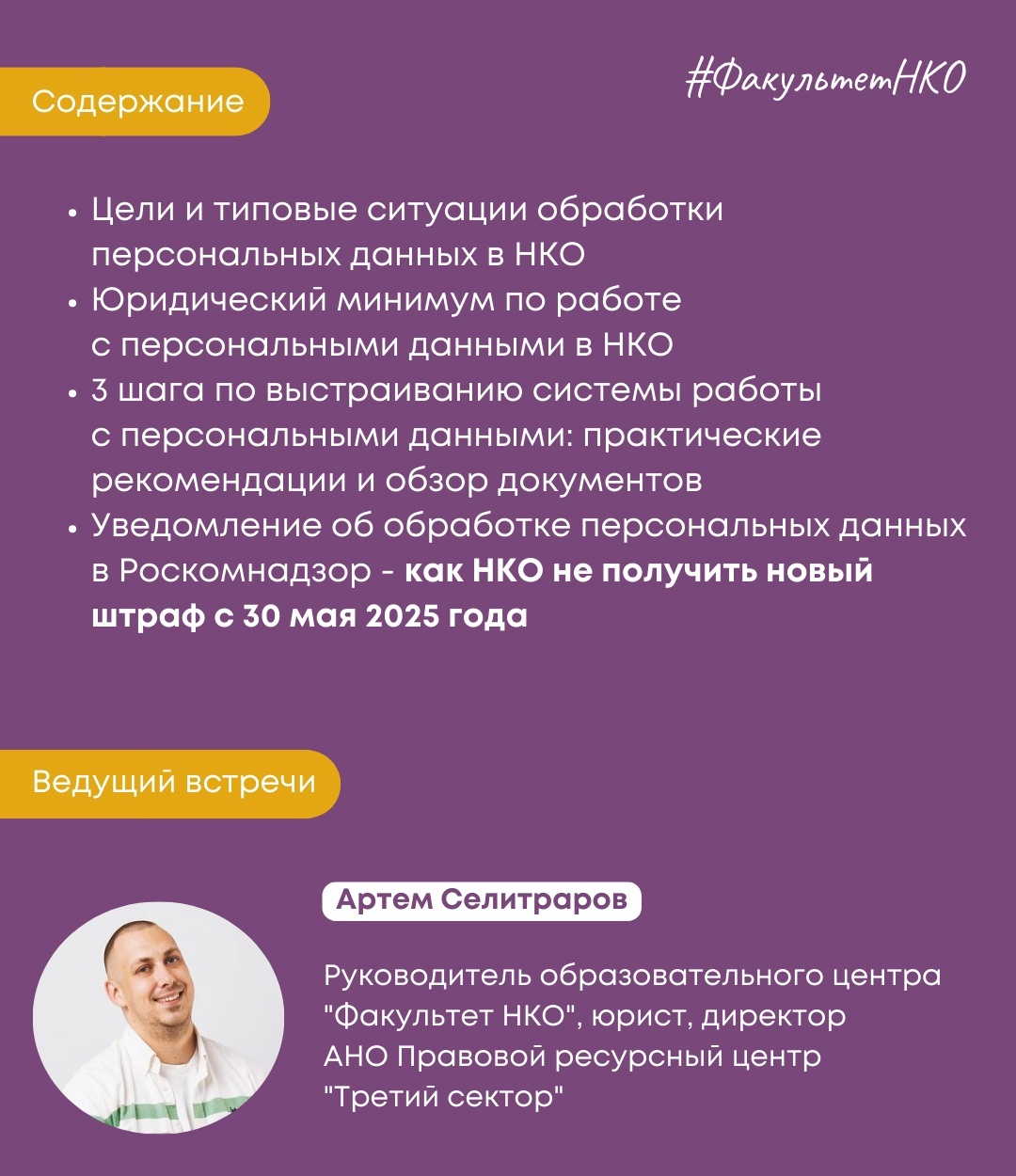 Ведущий вебинара: Артем Селитраров, юрист, руководитель образовательного центра "Факультет НКО", директор АНО Правовой ресурсный центр "Третий сектор"